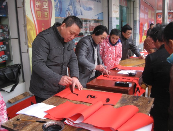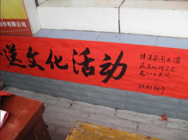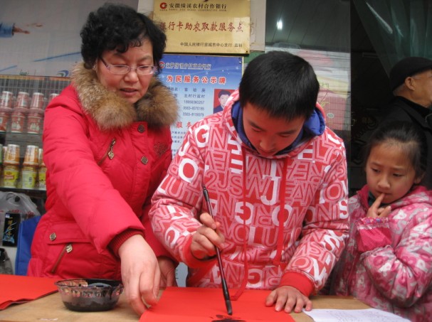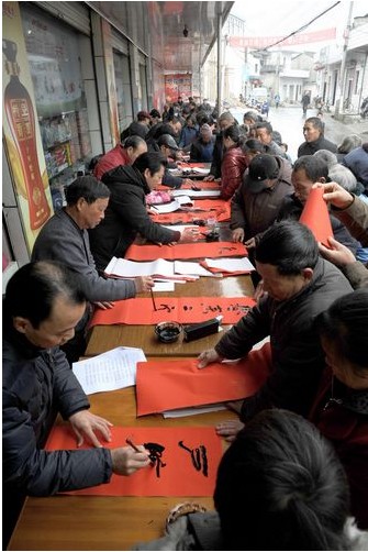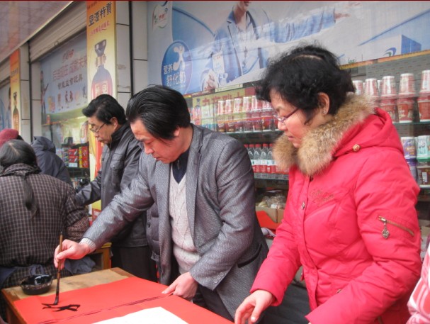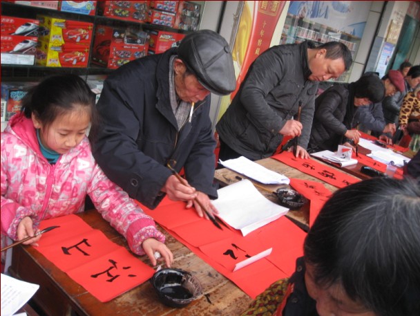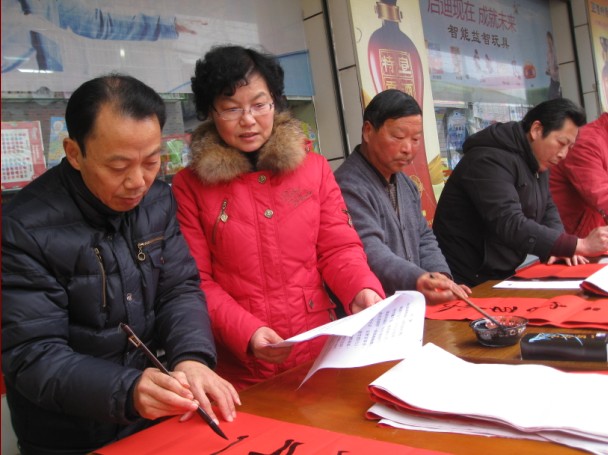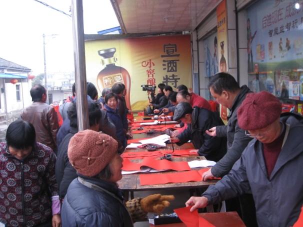 “迎新春、心连心”送文化下乡****1月29日,由绩溪县图书馆、徽文化研究会主办,龙川书画院和北村超市联合承办的“迎新春、心连心”现场挥墨门对赠春联活动在伏岭镇北村超市举行,千余幅暖心春联受到了老百姓的热烈欢迎。****参加义书春联的十余位书法爱好者中,有中国书法家协会会员,也有省市县书法名家;有八十多岁的耋耄老人,也有总角之年的中小学生。每一幅春联都行云流水,或端庄秀丽,或凝重沉稳,或洒脱飘逸,让老百姓们爱不释手。这天,闻迅赶来北村超市领取对联的人络绎不绝,书法家们也每求必应。面对老百姓的求联热情,书法家们从上午8点半到12点多,连续几个小时的挥毫舞墨,500张大红纸在他们笔下化身为千余幅充满喜气充满祥和充满祈愿的春联被老百姓一抢而空。