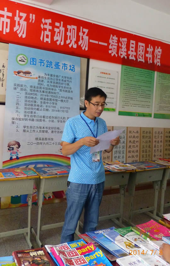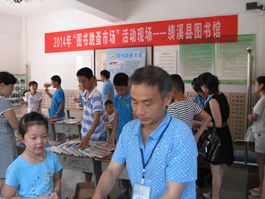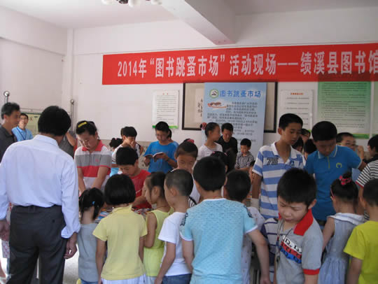 2014年暑假伊始,为了让孩子们体验社会、体验生活;为了让社会闲置的图书重新发挥它的价值;为了进一步拓宽读者的书源,让读者从更多的书中汲取营养,丰富自己的内涵,文明自己的言行,营造书声朗朗、书香四溢的文化气息,绩溪县图书馆在原有的“图书漂流”的基础上,特于7月8日在图书馆一楼大厅举办了主题为“绿色漂流 快乐分享”的 “图书跳蚤市场”活动。