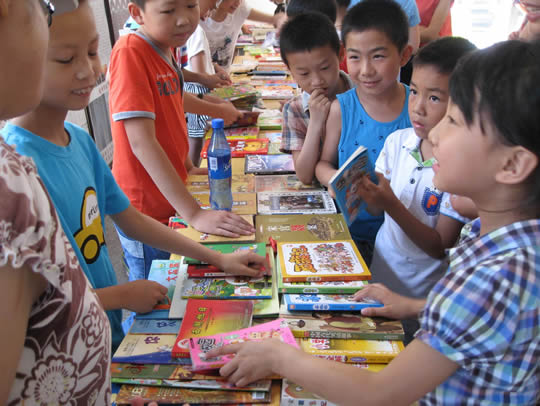 活动开始后,一本本、一摞摞的图书整齐地摆放在摊位上,求书若渴的孩子们兴奋地“钻”进了书海,去寻找着自己喜欢的图书。有的小“摊主”已在书上明码标价;有的小“摊主”却不好意思向“顾客”推销自己的图书;有的小“摊主”则提起嗓门大声吆喝起来:"好书,好书哩,全部半价,多买多送,机不可失,时不再来!”真是热闹非凡。很多家长也参与其中,为自己的孩子挑选心爱的图书,参与活动的每位“顾客”都在各个摊位前仔细地选择着自己想买或换的图书。