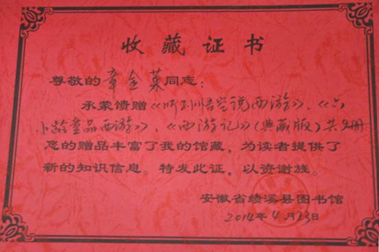 “六小龄童来绩溪啦!” 4月23日,著名演员美猴王六小龄童来绩溪签名售书啦。绩溪县图书馆在第19个世界读书日,积极与承办方的新华书店取得联系,于23日下午在新华书店处与六小龄童举办签赠仪式。 此次六小龄童带来了《六小龄童品西游》、《听孙悟空说西游》著作和《西游记》(珍藏版)。在火爆的签名售书后,绩溪县图书馆收到新华书店转赠的六小龄童的9册图书,为表示图书馆的谢意,图书馆给六小龄童先生送上了收藏证书,并希望六小龄童先生今后如有新书,可继续捐赠给图书馆,为广大的读者提供研究和学习的资源。 图书馆为了能让读者都能读到六小龄童的书,为了满足群众的需求,践行群众路线,特意多购置了几套,放在各借阅室,让经典伴随每个人的童年,让经典勾起童年的记忆。