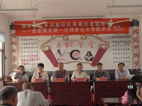 胡一龙禅宗山水专题讲座走进绩溪 5月23日下午,县文联在绩溪县孔灵村思诚学堂举办清华大学特聘教授,上海交通大学艺术顾问,中国美术家协会会员胡一龙禅宗山水专题讲座。县委常委、宣传部长汪旭红应邀出席讲座并致欢迎词。胡教授从我国书法美术发展的现状、艺术创作的方法、要遵循的法度等方面出发,为我县广大美术书法爱好者提供了指导与今后努力的方向。会后,胡教授还与我县美术书法爱好者进行了交流互动。讲座之前,汪部长为胡一龙导师写生基地揭牌。县图书馆参与。