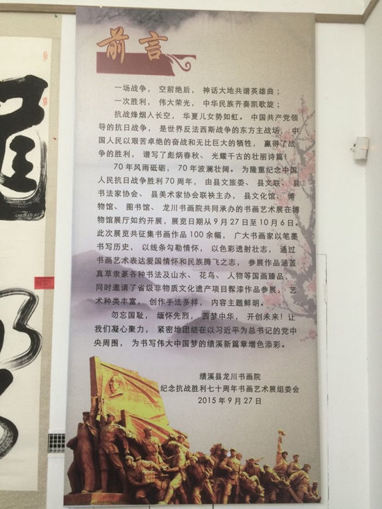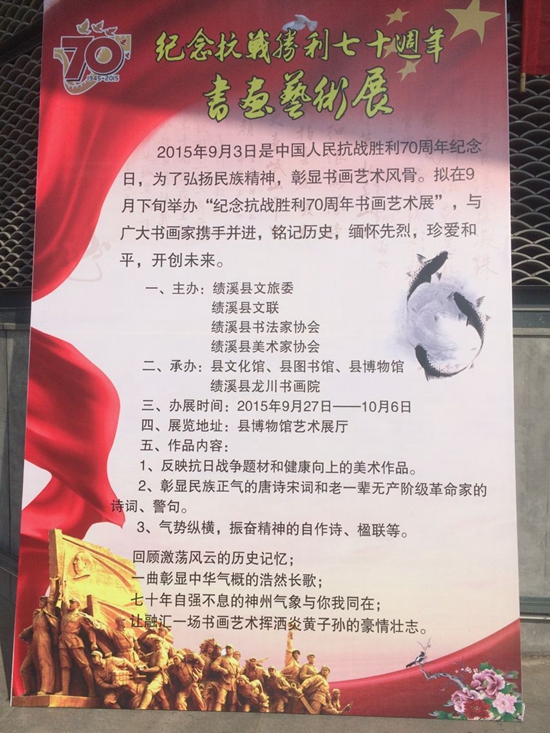 绩溪县纪念抗战胜利70周年书画艺术展于9月27日中秋佳节在绩溪县博物馆临时展厅展出。此次书画展由县文旅委、县文联、县书法家协会、县美术家协会联袂主办,县文化馆、博物馆、图书馆、龙川书画院共同承办,展览日期从9月27日至10月6日,共展出各类书画作品100余幅,参展作品涵盖真草隶篆各种书法及山水、花鸟、人物等国画臻品。同时邀请了省级非物质文化遗产项目髹漆作品参展,艺术种类丰富,创作手法多样,内容主题鲜明。 此次展览也是绩溪博物馆年内举办的又一以纪念抗战胜利70周年为主题的书画展。勿忘国耻,缅怀先烈,圆梦中华,开创未来!书画艺术家们用手中的笔墨抒发爱国之情,为书写伟大中国梦增色添彩。