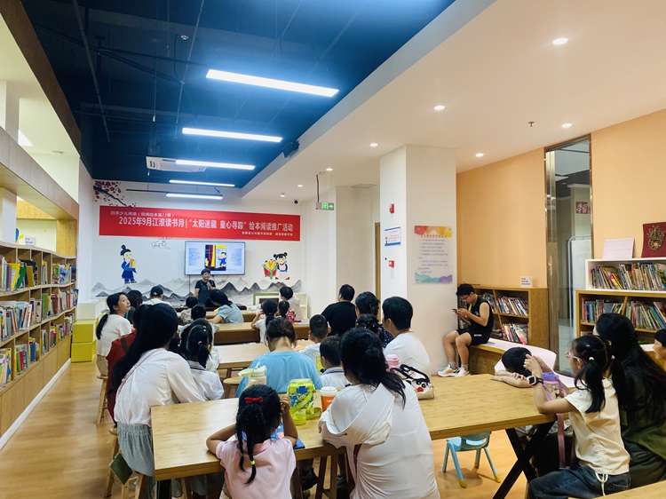 活动中,志愿者以生动的讲述带领孩子们走进绘本《如果今天太阳不见了》,从“异常早晨”的黑漆漆场景,到“乘宇宙飞船寻找太阳”的冒险旅程,小读者们沉浸在紧张、好奇与温暖的氛围中。在趣味互动问答环节,孩子们积极举手回答问题,展开想象,思考太阳在生活中的重要性。随后的交流讨论中,孩子们纷纷分享自己喜欢的故事片段,谈到“生活中太阳的作用”以及“曾经忽略过的事物”,在表达与倾听中逐渐理解“珍惜”的意义。